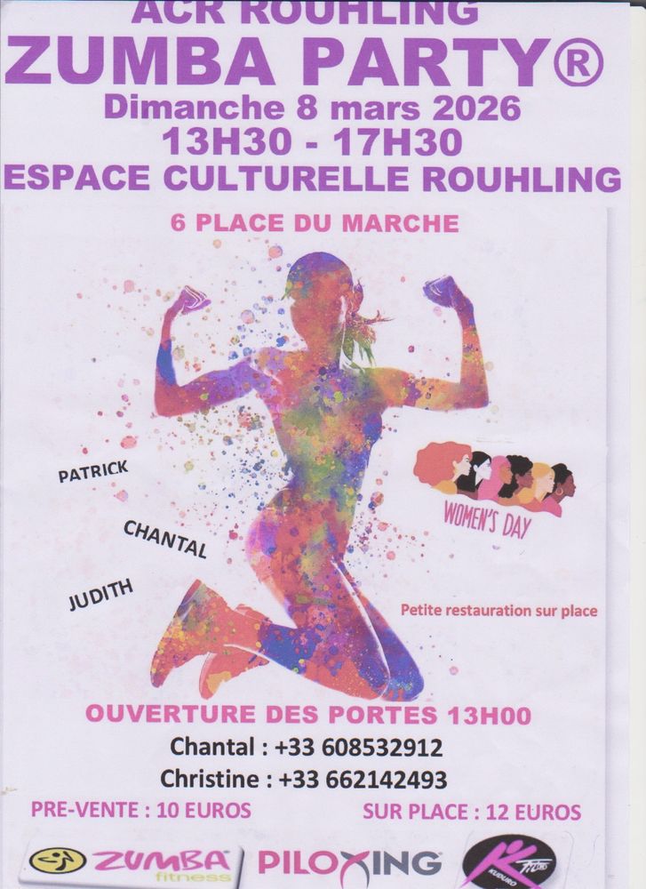 ZUMBA PARTY Organisée par l’A.C.S. DE ROUHLING le Dimanche 8 mars de 13h30 à 17h30 à l’Espace Culturel et Sportif Place du marché.