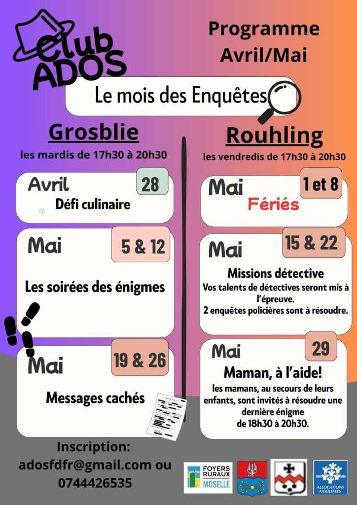 Voici le programme du club ados pour les mois d’avril et de mai.