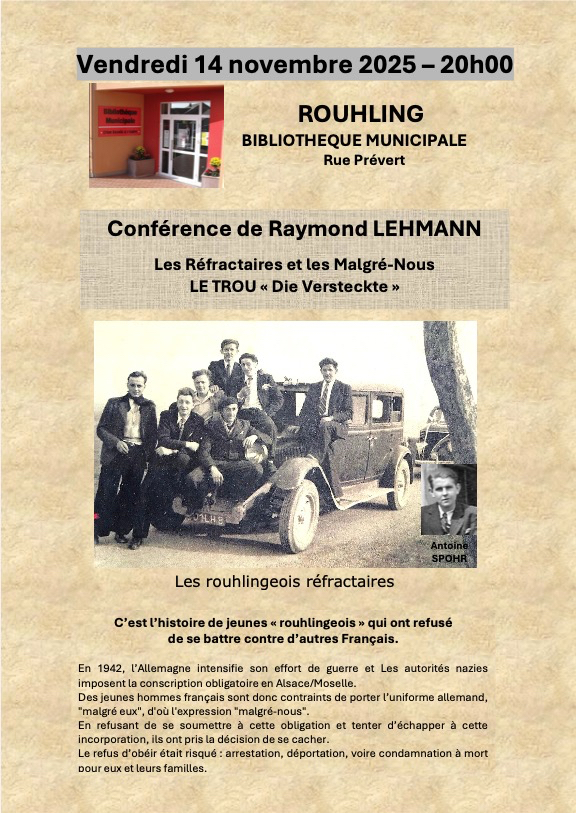 Conférence de Raymond LEHMANN sur « Les Réfractaires, les Malgré nous et LE TROU – Die Versteckte »