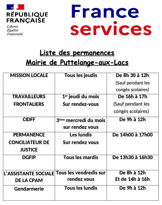 Santé, famille, retraite, droit, logement, impôt, recherche d’emploi, accompagnement au numérique : à moins de 30 minutes de chez vous, à la mairie de Puttelange-aux-Lacs, les agents France services vous accueillent et vous accompagnent pour toutes vos démarches administratives du quotidien au sein d’un guichet unique.